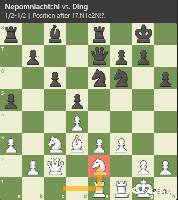 选手们关注着2022年国际象棋大师赛中吉里和丁立人之间的快棋对局,直到第17步。涅波姆尼亚奇率先用17.N1e2而不是吉里的17.Qf2 开始出现偏差。