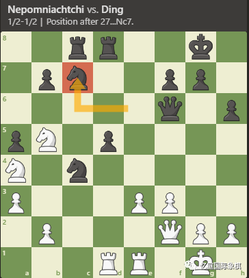 这盘棋的最后关键时刻是丁立人选择下27。。。Nc7。“我也考虑过27。。。d4,而不是。。。Nc7,但是在exd4之后太冒险了。所以,我认为,最后,平局对我们双方来说都是一个相当不错的结果。”
