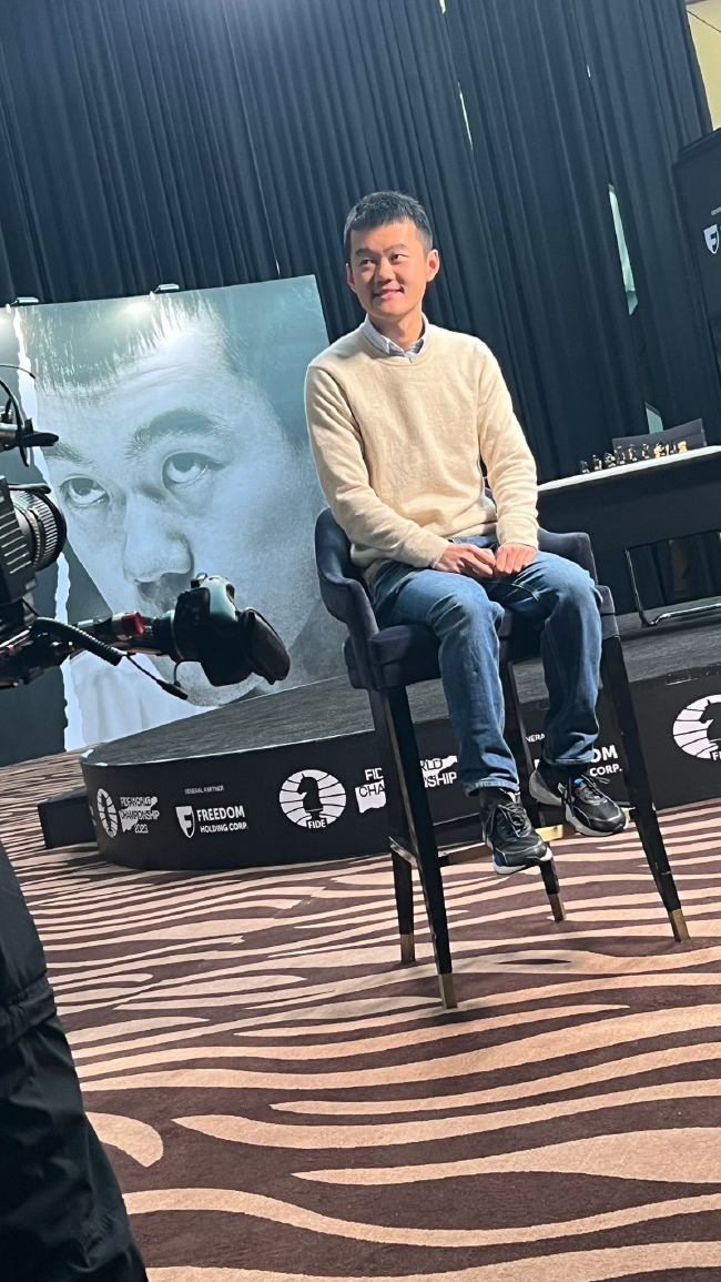 北京时间4月6日,即将在哈萨克斯坦首都阿斯塔纳开战的2023年国际象棋世界冠军赛进入最后的倒计时,丁立人参加了主办方组织的若干活动,其中包括媒体采访环节。