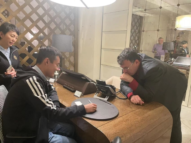 北京时间4月6日,2023年国际象棋世界冠军赛中方代表团来到赛场适应场地,丁立人体验了比赛桌椅和棋具。