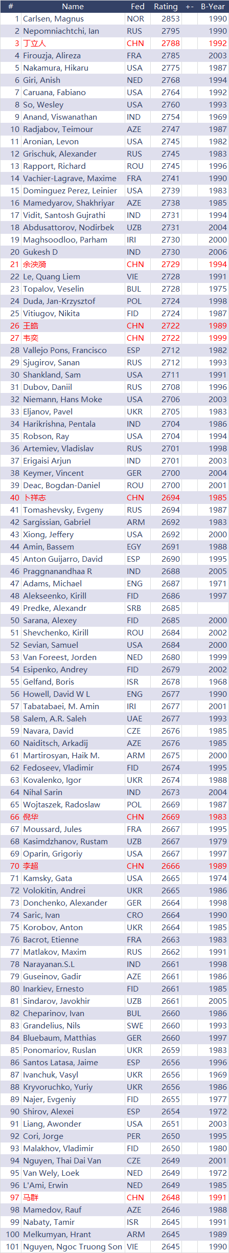 值得注意的是,丁立人在比赛中与卡尔森并列第一;因此,两人进行了快棋和闪电战的决胜。在打平两场快棋后,丁立人在连续的闪电战中击败了卡尔森,获得第一名。为了表彰这一令人难以置信的壮举,国际象棋界选定丁立人为卡尔森王位的继承人。似乎没有什么可以阻挡丁立人的道路。